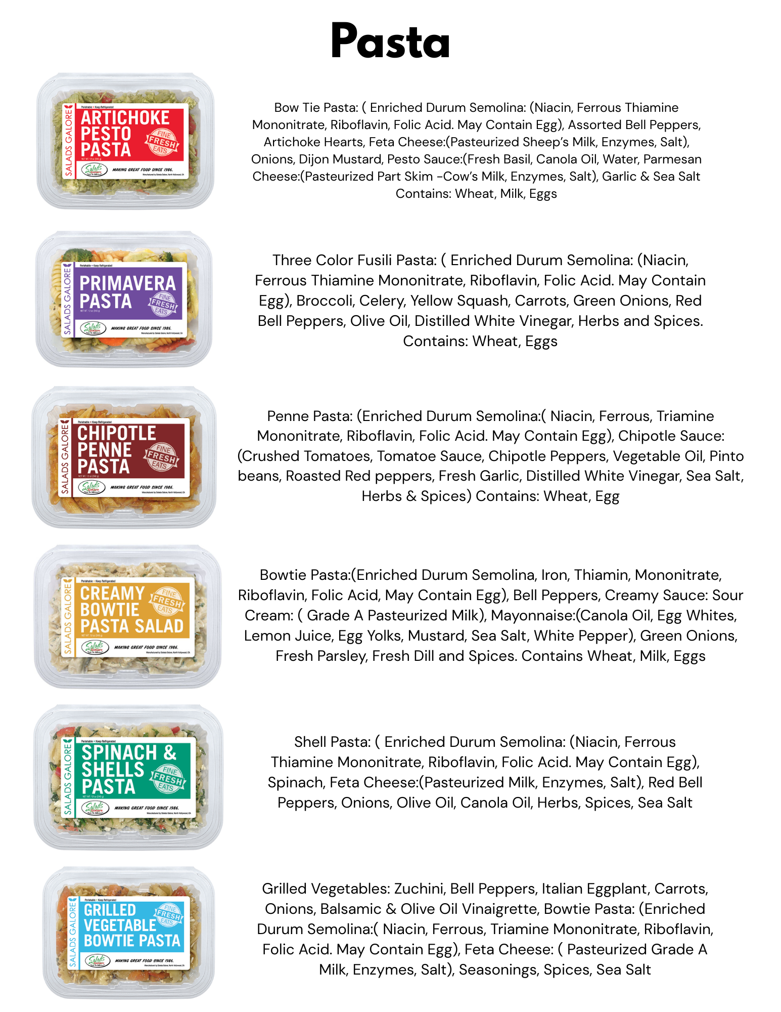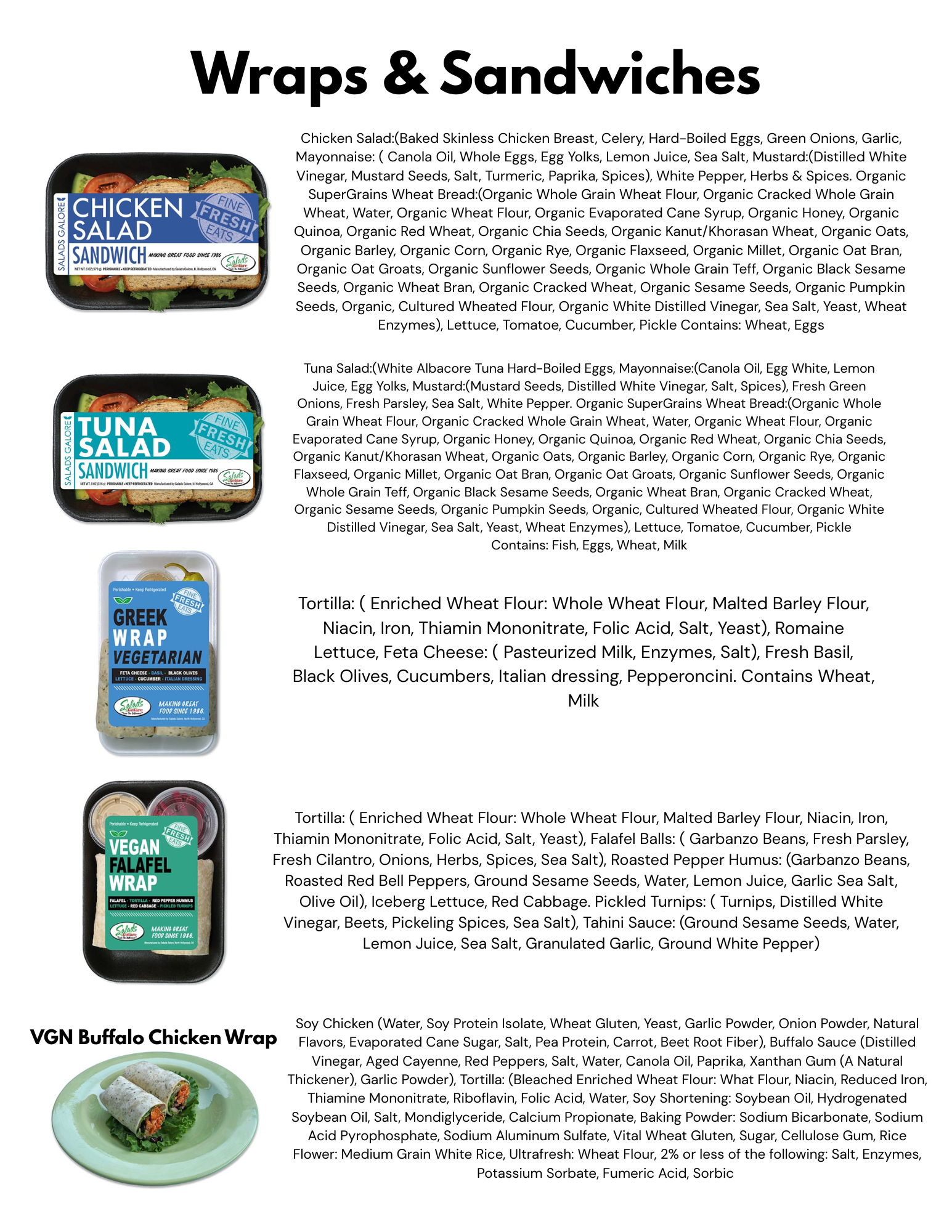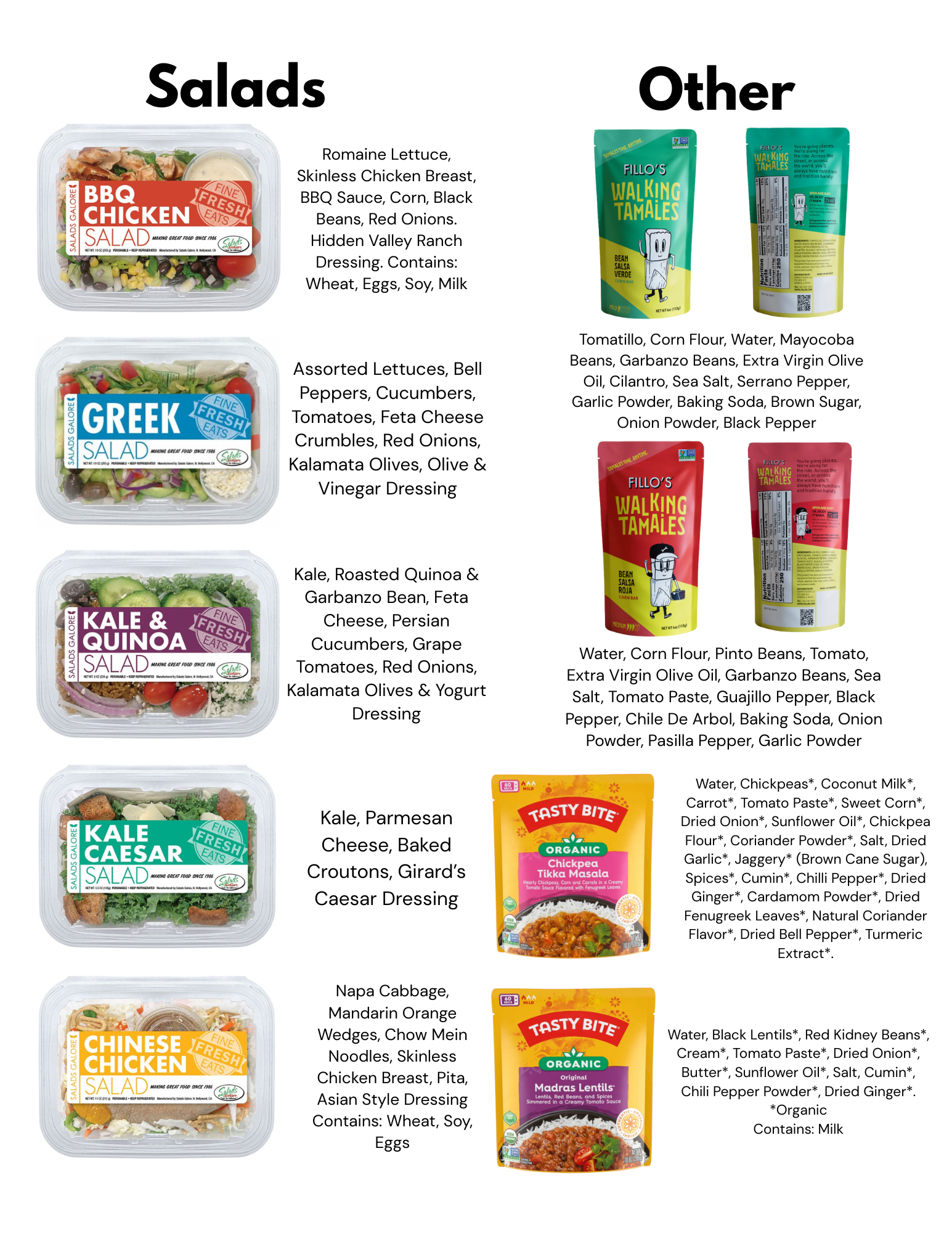 Our community vending machines contain a variety of prepared food items; pastas, wraps, salads, sandwiches, and more! For more information about the ingredients in these products, see below.